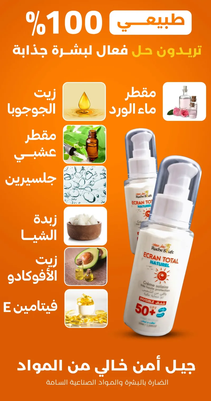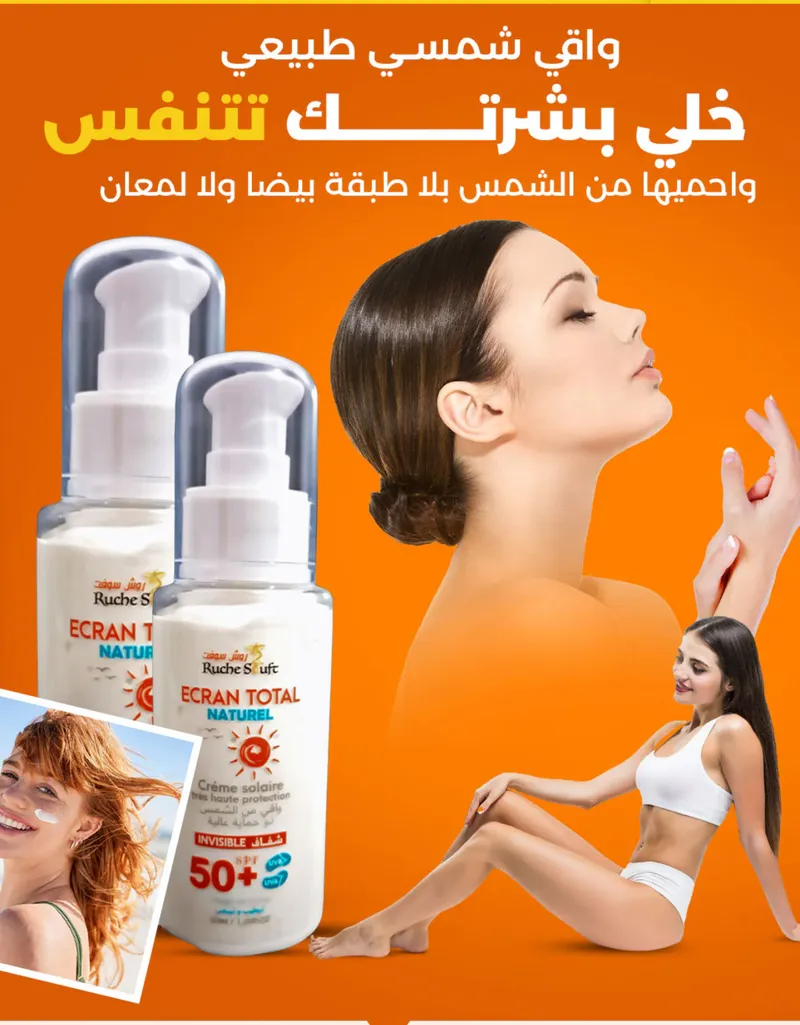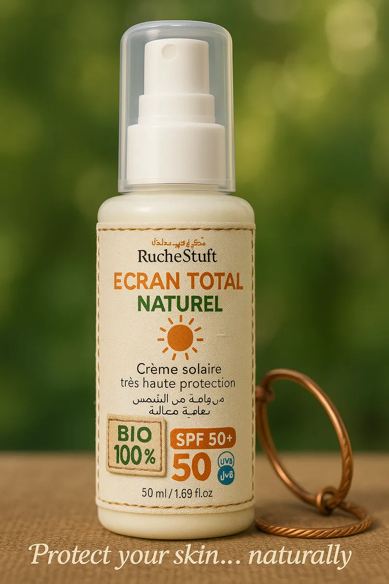 واقي الشمس موجود في كل مكان… لكن الطبيعي وين تلقاه؟! قولي وداعًا لتهيج البشرة والمواد الكيميائية! Ruche Stuft جابلك حل طبيعي 100% واقي شمس شفاف، غير دهني، حماية SPF 50+ صالح للوجه والجسم وحتى للبشرة الحساسة!