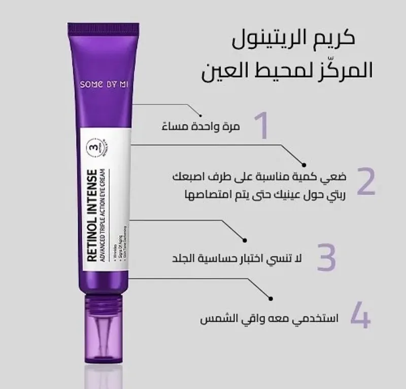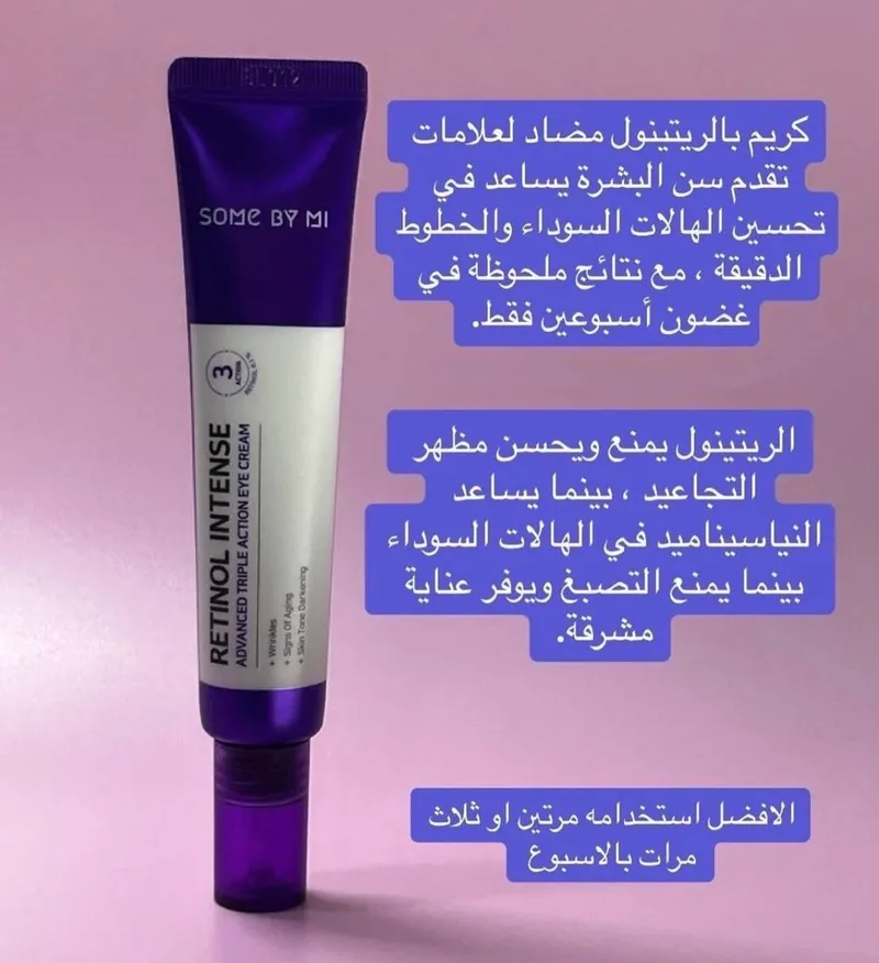 اقوى معالج للهالات السوداء تحت العينين والتجاعيد Retinol Intense Advarced Triple Action Eye Cream الكوري 🇰🇷 هو أفضل كريم عين موجود حرفيا كريم ريتنول العين المركز المتقدم ثلاثي المفعول من سوم باي مي الكورية 🇰🇷 للهالات السوداء والخطوط الدقيقة والتجاعيد يتكون كريم العين المضاد للشيخوخة هذا من الريتينول والنياسيناميد لتحسين مظهر الهادت السوداء والخطوط الدقيقة با ضافة إلى ذلك يوفر البانثينول ترطيبا لمنطقة أسفل العين